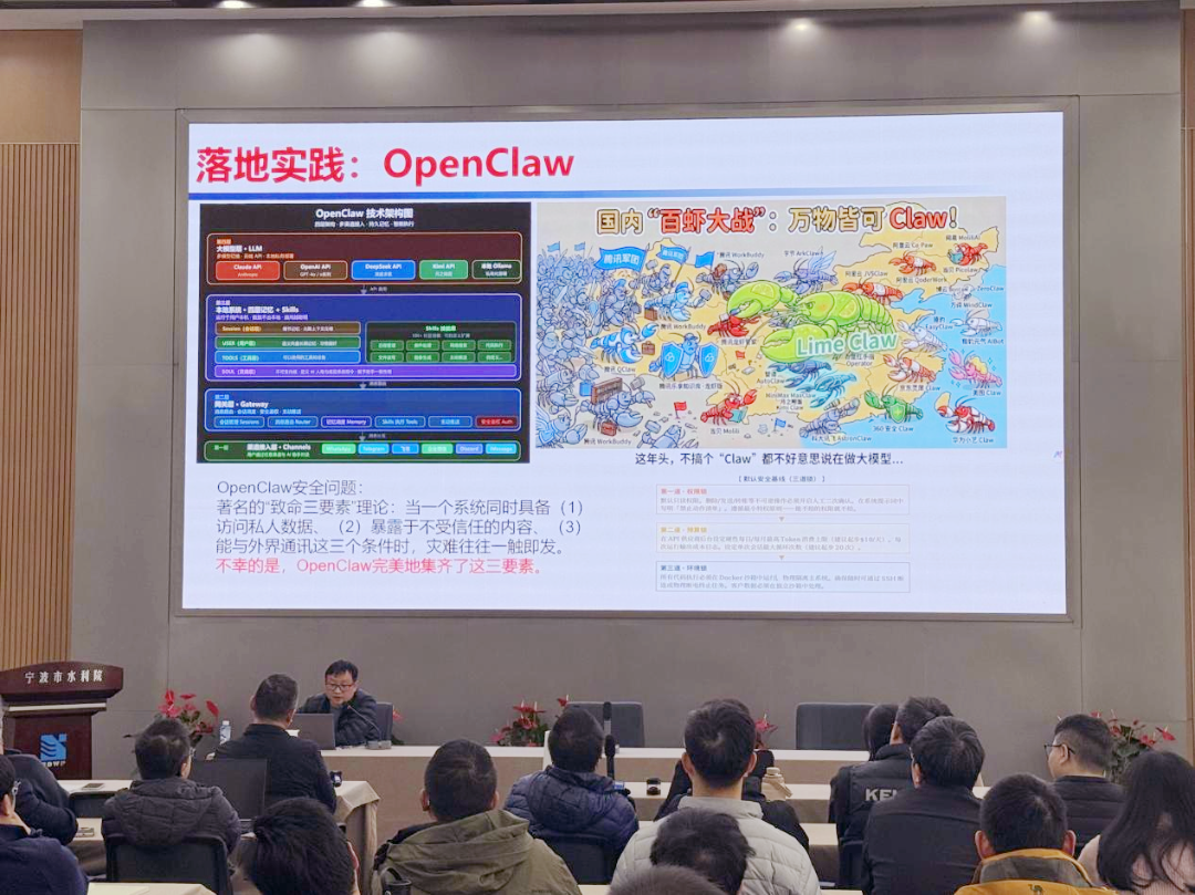 本次專題培訓(xùn)圍繞AI智能體的概念展開,簡要分析其與大模型的區(qū)別,系統(tǒng)闡述了智能體的發(fā)展歷程、構(gòu)成要素及落地實(shí)施路徑,并現(xiàn)場演示了“數(shù)智水院智能體”及當(dāng)下流行的OpenClaw等應(yīng)用實(shí)踐案例。演示環(huán)節(jié)生動(dòng)直觀,引發(fā)參訓(xùn)干部的濃厚興趣。大家紛紛表示深受啟發(fā),對(duì)AI賦能勘察設(shè)計(jì)工作有了更清晰的認(rèn)知和更強(qiáng)的信心。